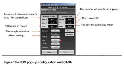 From the analysis of previous tapping incidents the high-high alarm limit is sometimes not sufficient to warn the tapping floor personnel to evacuate the area. The time from the start of the rise in temperature until the actual incident was in some cases between 1 to 2 minutes. For this reason a rate of change (ROC) alarm was introduced, which measures the rise rate of both the water and copper temperatures. The ROC alarms are based on the difference between two sample means. Figure 10 shows the SCADA pop-up of the lintel cooler on furnace no. 1.