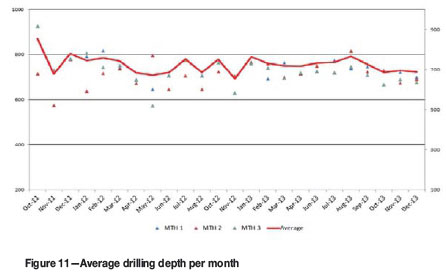 When opening a matte tap-hole during normal operations, a hydraulic mudgun and drill is used to partially drill open the clay-filled tap-hole until the solidified matte layer is reached. The average drilling depth to achieve this is normally between 700 and 900 mm. Before commencing with lancing, an operator measures the depth drilled and reports the measurement to the control room. In general, good drilling depths were achieved from 2011 to 2013, as indicated in Figure 11. An alignment check on the drilled hole is also done with a T-bar to prevent the operator from lancing skew in the event that the drill was misaligned.