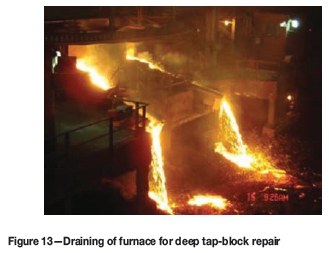 The decision to conduct a tapping module repair is based on the time it takes to fill a 12 t refractory-lined ladle. From operational experience, a tapping time of less than 11 minutes indicates possible wear of the tap-hole and requires a tap-block repair. The tapping modules on every tap-hole are replaced on a bi-weekly basis. From one to five tapping modules can be replaced, depending on the physical condition of the tapping modules during the repair. During this intermediate repair no doghouse refractories are replaced. The condition of the Mickey block is also monitored during these repairs.