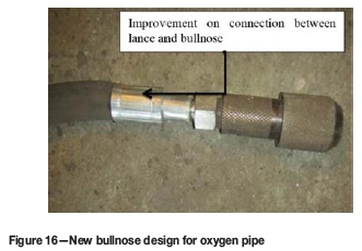 In the past, frequent incidents occurred where operators burnt their hands while lancing due to oxygen leaks. These leaks occurred between the connection of the bullnose and the flexible hose. The bullnose was subsequently re-designed to make the connection to the flexible hose more robust and less prone to leaks. Figure 16 indicates the new design.
