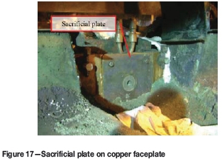 A sacrificial plate of mild steel is placed in front of the matte faceplate to protect the copper against hot matte splashes during the tapping process. The sacrificial plate is used as a consumable and is changed during every tap-block repair or when the plate is damaged during the tapping process. Figure 17 shows how the sacrificial plate is installed onto the copper faceplate.