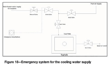In the event that the copper face plate comes in contact with matte during the tapping process, water could leak from the faceplate into the liquid matte stream and cause violent explosions. In order to mitigate this risk, three emergency push-buttons were installed in each mudgun station for each matte tap-hole. When a leak at one of the tap-holes is detected, the emergency push-button is activated, closing the supply line valve of the cooling water to that circuit. The air supply valve automatically opens to flush the system, making it safe for the operators. The supply valve can also be closed from the SCADA or from a manual isolation valve in the tapping cabin. Figure 18 is a schematic diagram of the emergency system currently installed at furnace no. 1.