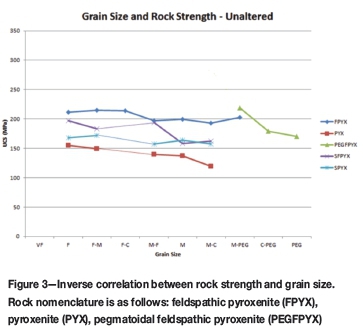 The results show that rock composition and mineral content influence the range of UCS for specific rock types. Feldspathic pyroxenite (FPYX) has a higher feldspar content than pyroxenite (PYX), resulting in a higher mean UCS. The curves in Figure 3 indicate an inverse relationship between grain size and rock strength for unaltered rocks. This relationship was confirmed with a set of 41 feldspathic pyroxenite samples from exploration core. The variability in UCS between rock types shows that major rock types differ sufficiently in mean UCS to allow for rudimentary geometallurgical rock strength characterization.