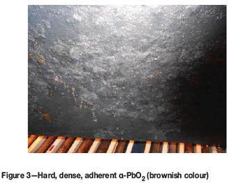 The first stage in lead oxidation in the presence of oxygen is the formation of lead monoxide (PbO) and lead sulphate (PbSO4). As the anode potential increases, the surface layer of PbO/PbSO4 transforms to Pb(OH)2, followed by conversion to the insulating tetragonal PbO, and then finally to PbO2 at higher potentials. As evident in Figure 2, it is necessary to maintain an anode potential above 1.77 V to maintain the protective a-PbO2. Unless the anode potential is consistently maintained above this value, the protective, adherent a-PbO2 converts to the loosely adherent p-PbO2 that flakes off and causes cathode contamination. This electrochemical layering effect explains the commercial success of lead-based anodes in sulphate media electrowinning in the last few decades.