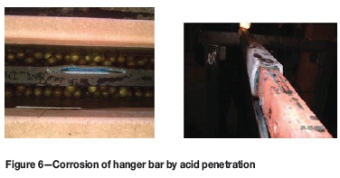 This type of corrosion is illustrated in Figure 6 and is most prevalent in covered copper tankhouses. Corrosion of lead by copper sulphate could weaken the integrity of the lead coating and allow penetration of the acid into the area between the protective lead encapsulation and the copper bar. This results in the formation of a significant amount of copper sulphate underneath the lead covering the hanger bar. Expansion upon crystallization of copper sulphate forces the lead away from the copper bar. This process becomes iterative, resulting in an eventual splitting of the lead castaround, as shown in Figure 6. Local and independent concentration cells are also set up in the region between the lead castaround and copper hanger bar, causing the copper to be corroded rapidly.