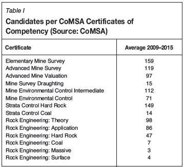 In order to ensure a commonality between the various mine-specific competency requirements, CoMSA developed three CoCs that accommodated the three stages of competency required by a mine surveyor to progress to a point where he or she could be promoted to a senior position and become eligible to enrol as a candidate to the examinations for the GCC: Certificated Mine Surveyor. This 'suite' of CoMSA CoCs continues to enjoy strong support from the SAM&MS. From figures obtained from CoMSA it appears that for the period 2009-2015, an average 159 candidates attempted the Elementary Certificate: Mine Surveying and 119 candidates attempted the Advanced Certificate: Mine Surveying. Chapter 17(1)(b) of the MHSA defines a Competent Person: