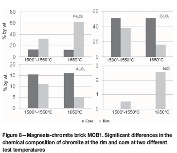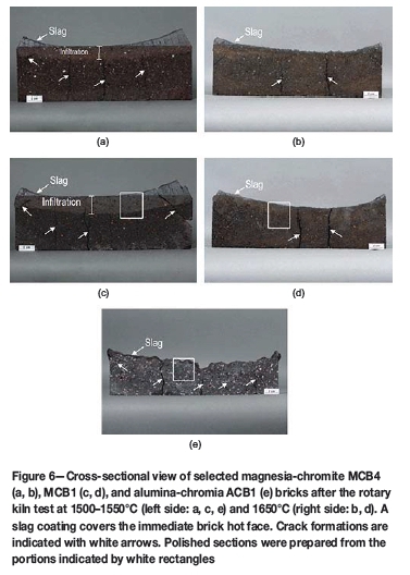 Figure 1e shows the virgin brick microstructure for comparison. The brick is based on fused magnesia-chromite and chromium ore.