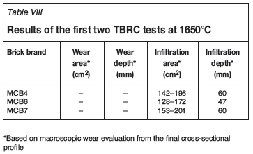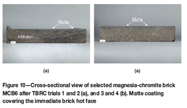 During the first two tests in the pilot TBRC none of the tested magnesia-chromite brick brands showed wear. In cross-section, the deeply infiltrated brick microstructure over the whole cross-section (approx. 60 mm from the hot face) was visible (Table VIII). Only in the case of brick MCB6 was the infiltration depth 47 mm from the hot face (Figure 10a).