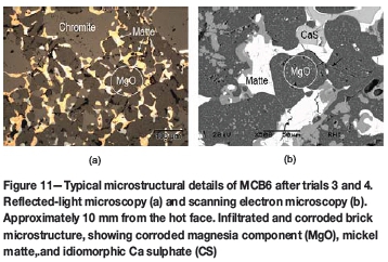 ► During the final two tests (3 and 4), the corrosion of magnesia fines and the coarse magnesia grains by sulphur was significant. Idiomorphic and newly precipitated MgO crystals and Ca sulphate were also observed (Figure 11b).