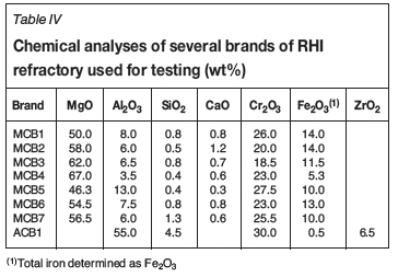 The slag amount as a function of <A> was compared for the different refractory bricks (see Figures 9a and 9b) at 1550°C and 1650°C. The alumina-chromia brick showed a considerably higher solubility than the magnesia-chromite brands. The refractories can be ranked according to solubility, which increases in the order: