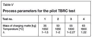 Testing with nickel matte in the pilot TBRC, which was heated by a methane-oxygen burner, was carried out at a process temperature of approximately 1650°C (Figure 3b). This temperature was chosen because of the rotary kiln test results: it generated an identical post-mortem structure at this temperature. Oxygen was added to remove sulphur (Figure 3c). In total four trials were carried out under different sets of process parameters. The process parameters for all tests are summarized in Table V.