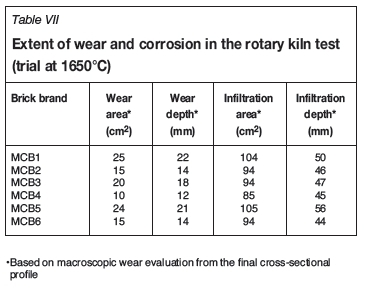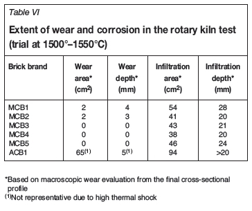 All brick samples tested showed cracks caused by thermal shock during kiln operation. In the magnesia-chromite brick brands, either minimal or no wear was visible (Table VI). The greatest infiltration depth was identified in MCB1. The high wear observed for the alumina-chromia brick ACB1 can be explained by crack formation caused by thermal shock from the initial testing and subsequent loss of refractory