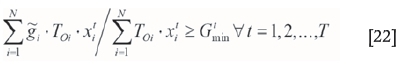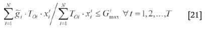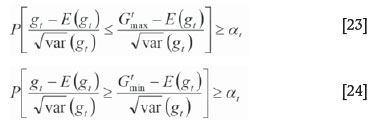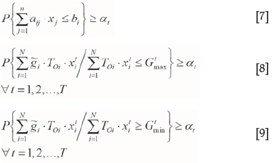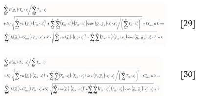 Now, the values for the expected value and variance of a random variable are substituted into Equation [28], and the grade-related constraints are given by Equations [29] and [30].