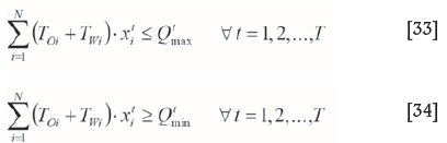 The tonnage of ore and waste materials mined in one period cannot exceed the maximum capacity or be less than a minimum capacity of equipment available in that period. Accordingly, the constraints of the maximum and minimum capacity of equipment can be formulated as Equations [33] and [34].