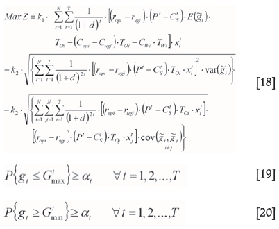 After applying changes associated with the random variable to the objective function and constraints, they are non-linearized. They can be converted into linear mode using linear approximation methods, or the model can be solved in the same nonlinear mode. When a parameter is randomly considered in stochastic programming, some changes are made to the objective function and constraints. Assuming that a random variable has a normal distribution, a specific probability is considered for a constraint, and then the expected values and the variance are calculated. Given that the random variable has a normal distribution, the objective function would also have a normal distribution, and the expected value and variance would be calculated in the objective function. In such a case, a new objective function is defined in two stages: the first stage consists of maximizing the average of NPV, and the second is minimizing deviation from the main objective, which is the maximization of NPV.