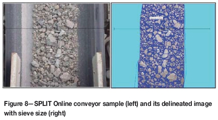 After ignoring non-fragment pixels, the remaining pixels are grouped into two clusters. A fragment's rock type is estimated after assigning it to an appropriate cluster, based on its average likelihood as determined by the PLSR code. Not all pixels of a fragment are homogenous, possibly because of variations in fracture or mineral content. In some cases, the detection of non-fragment pixels may not be a significant issue. For example, a real conveyor's background - such as in Figure 8 (left) and the delineated SPLIT image in Figure 8 (right) - will have no exposure since the fragments are very closely packed. In such cases, approximations can be made about the ore type and volume of the very small non-delineation dust-like fragments.
