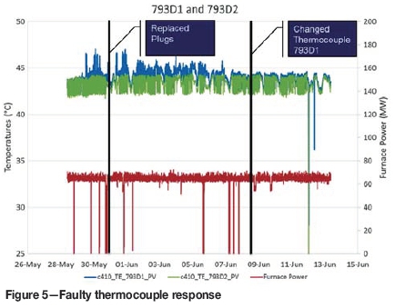 Any PCA events that were noted were thoroughly investigated. An example of this was the instantaneous detection of a faulty thermocouple through visual inspection of the data following an event notification, as shown in Figure 5. The thermocouple in question was raised as a PCA event and before the variations could result in a furnace trip, the plugs were changed. The thermocouple was replaced during the subsequent brick repair. This is indicative of preventative maintenance which allowed for the reduction of nuisance trips with an improvement in furnace stability.