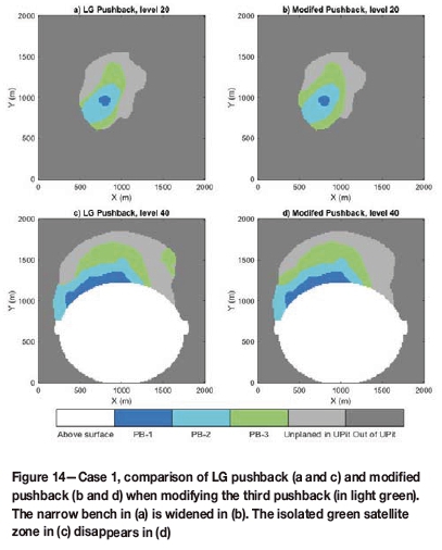 , i.e. the unplanned pushbacks in the ultimate pit. Obviously, the previous pushbacks are already treated and are feasible. For the current PB, modifications should ensure all the geometrical constraints are fulfilled. Also, it should not be ignored that the future PB, the unplanned part, needs also to fulfill the width constraint. Otherwise it can happen that when treating later phases, no valid geometry can be found.