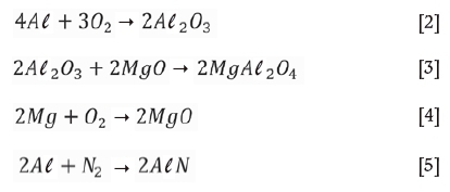 It should be noted that the amount of Mg in the Al alloy has a considerable effect on the type of the oxide formed. Silva and Talbot (1989) reported that at 725°C for an Al melt containing above 1.5 wt% magnesium, the most stable oxide is MgO, whereas in Al alloys with Mg contents in the range 0.02-1.5 wt% the most stable oxide is MgAl2O4. Below 0.02 wt% Mg, alumina is expected to form. The oxygen and nitrogen reactions with the surrounding melt for different Al alloys are described by the following four equations eactions (Raiszadeh and Griffiths, 2006; Aryafar, Raiszadeh, and Shalbafzadeh, 2010; Yang et al, 1996; Griffiths, El-Sayed, and El-Sayed, 2016):