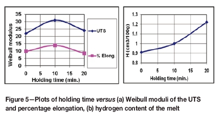 5. The amount of hydrogen diffused into bifilms is suggested to increase by extending the holding period to 20 minutes, perhaps resulting in the formation of oxide-related hydrogen-containing porosity. This caused a reduction in the Weibull moduli of the UTS and percentage elongation by about 23% and 39% respectively.