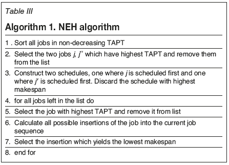 which in turn is used to the form the total average processing time for all jobs TAPTj = JsAPTjs. In Algorithm 1 (Table III) the NEH algorithm for minimizing makespan is given in pseudocode. In order to be specific, assume that in step 2 we select job j1 and j2. The makespans of the two schedules are then calculated, one for the job sequence j1, j2) and one for the job sequence j2, Assume that the makespan of j1, j2) is lower than that of (j2, the sequence (j2,j1) is then discarded. At step 3 we consider a new job j3; we then evaluate all possible insertions of the job into the current sequence of jobs. In this case we evaluate the makespan of three schedules; j3,j1,j2), (j1,j3,j2), and (j1,j2, j3). Similarly, the schedule with the lowest makespan is kept, while the others are discarded. This continues until the list of unscheduled jobs is empty. Once a sequence has been determined the criterion used for allocating machines at each stage is often based on the earliest finishing time. The NEH algorithm is very flexible since the assignment of jobs to machines can be based on any criteria, not only makespan. (Table III).