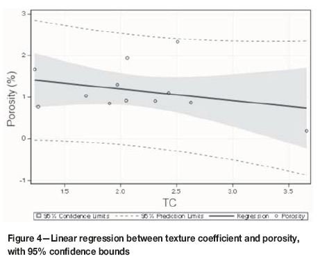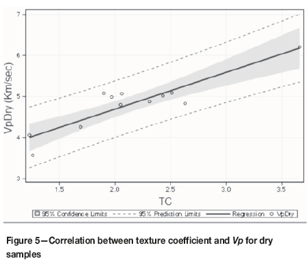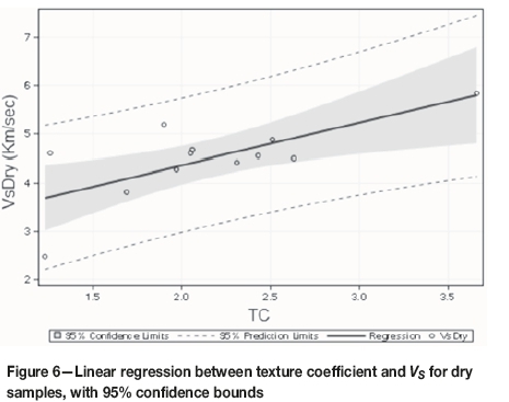 Seismic parameters (Vp and Vs) increase with increasing TC, with high correlation (Figures 5-8). Most of the rocks examined in this study are granites with low porosity and strong bonding. The Anatolian gray, Bergama gray, and Bergama kozak granites fell above the upper bound of the confidence interval. These rocks had fine to medium grain sizes and low matrix areas. Emerald pearl, which fell below the upper bound of the confidence interval, had a medium to large grain size (Table I) and a relatively large matrix area. These results indicate that grain size plays an important role in seismic velocity. Gupta and Sharma (2012) found a similar relationship between grain size and velocity. They explained this situation as 'the grain elongation reduce[s] the contact area of any two individual grains, so reducing the attenuation and therefore increases the seismic wave velocity'.