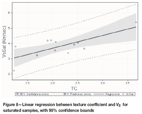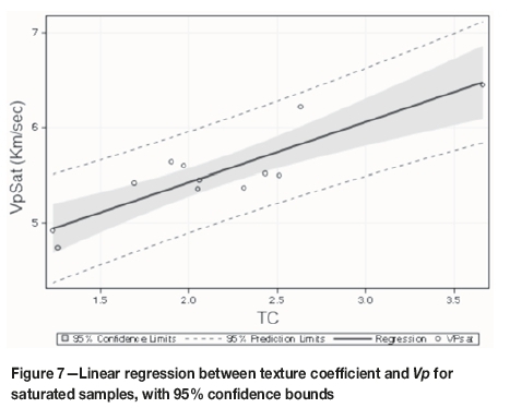 The correlation between seismic velocity and TC was stronger for Vp than for Vsand stronger for dry samples than for water-saturated samples. These results were expected because of the change in wave spread type and degree of cementation with grain packing density. The correlation coefficients for the dry and water-saturated samples were similar.