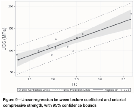 The most important mechanical property of a rock is its compressive strength. TC is useful for predicting the UCS values of rocks, especially for similar lithologies (Azzoni et al., 1996; Ersoy and Waller 1995; Ozturk, Nasuf, and Kahraman, 2014). Gupta and Sharma (2012) and Howart and Rowlands (1987) found a good linear relationship between UCS and TC, whereas Alber and Kahraman (2009) found an inverse logarithmic relationship. However, Azzoni et al. (1996), Ersoy and Waller (1994), and Ozturk, Nasuf, and Bilgin (2004) found UCS and TC to be only weakly correlated or not significantly correlated for different lithologies. Similarly, contradictory correlations have also been reported between TC and strength. Ozturk, Nasuf, and Bilgin explain this situation by the close relationships of UCS and other mechanical properties with the mineralogical and petrographic properties of the rocks. However, estimations of the mechanical, physical, and textural properties of a rock can vary over a wide range, even for similar types of rock, because of the variability of the rock material.