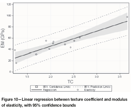 In this study, very significant correlations were found between TC and UCS (r = 0.92) and TC and EM (r = 0.93) for all the rocks, within or near the 95% confidence limits boundary, as can be seen from Figures 9 and 10. This is the result of the rocks having similar quartz contents and textures that presented a physical barrier to crack propagation. Tiryaki and Dikmen (2006) explained this situation in terms of the TC model representing a measure of the resistance of the microstructure of rocks to crack propagation. As shown in Figure 9, a very significant correlation was obtained between TC and UCS. The Bergama gray rock, which is highly altered, lay above the upper limit of the confidence interval. The Aksaray yaylak, Bergama kozak, and Kaman roza rocks exhibited sericitization in their thin sections and fell below the confidence interval.