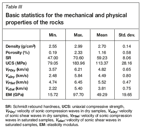 The block samples were subjected to rebound testing using a Digi-Schmidt 2000 according to the procedures described by ISRM (1981). SR was measured at a minimum of 20 different points on each sample. The results are presented in Table III.