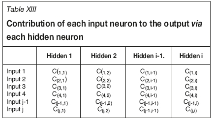 For Input I = 1 to j where j = no. of variables, hidden neurons h= 1 to i, where i = no. of hidden neurons and For Output O = 1 to o, where o = no. of outputs Weight of input variable j and hidden neuron i = Wji Weight of output o and hidden neuron i = Woi Contribution of each input neuron to the output via each hidden neuron is given by (Table XIII):