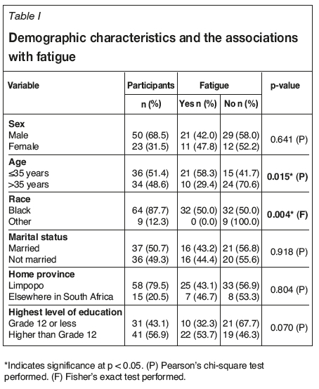 Results of the Pearson chi-square and the Fisher's exact tests are shown in Tables I and VI, together with the percentage of participants in each category that were identified as fatigued. Both age and race were associated with fatigue (p<0.05, Table I). A higher proportion of those aged 35 years or younger reported to be fatigued than those older than 35. Black participants reported fatigue more frequently than those of other race groups. The proportion of participants that was not black was small, which could influence the validity of this result. Most of the non-black participants (89.9%) were over 35 years and only 22.2% of this group did shift work. No statistically significant associations with fatigue and sex, marital status, home province, or education were seen.