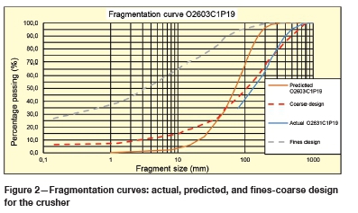 Crusher design fragmentation results are shown in Figure 2 as an envelope formed by fines design and coarse design curves developed by the use of PSD. Therefore, if the predicted and actual fragmentation curves fall within the fines-coarse envelope this indicates that the ideal/desired fragmentation profile is achieved. The actual and predicted fragmentation curves shown in Figure 2 do not fit into the fines-coarse envelope. Both the actual and predicted curves are closer to the coarse side, hence there is a greater probability of boulders forming. It is important to note that the values shown in Figure 2 may exceed the maximum values on the graph as shown in Table I. This raises the question 'Will the analysis of previous blast information correctly predict an optimal fragmentation curve?