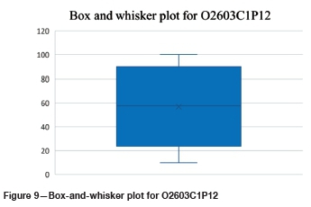 From Figure 9, the data seems to be relatively evenly distributed. However, the median is 57.67, and the differences between the Q1 and the minimum, and the maximum and Q3 values, are 27.79 and 20.28 respectively. The 7.51 difference between the two values shows that the spread of fragments for this blast is relatively even for the top 50% and the bottom 50% of the data.