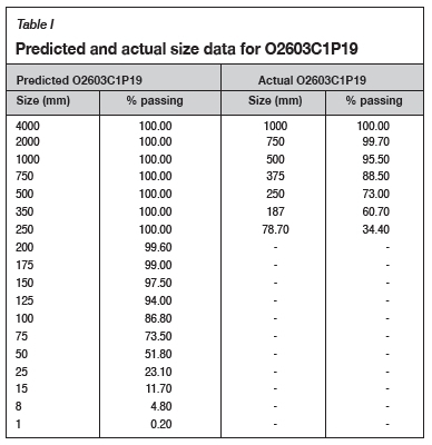 The Kuz-Ram fragmentation model is used to predict fragmentation size distribution. It is important to note that on the graph, fragment sizes range from 0.1 mm to 1000 mm. This does not limit the predicted and actual fragment sizes to the graph constraints. This is shown in Table I, with size fragments in millimetres and percentage passing data for O2603C1P19 of up to 4000 mm.