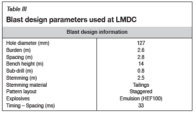 For drilling and blasting design purposes, 'rules of thumb' are normally used but at LMDC they were not effective. Therefore, it was important to derive a solution to achieve optimal fragmentation as this would reduce delays in the mine production cycle.