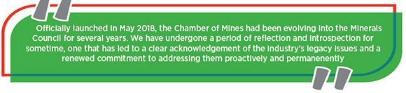 Although only officially launched in May 2018, the Chamber of Mines had been evolving into the Minerals Council for several years. We have undergone a period of reflection and introspection for some time, one that has led to a clear acknowledgment of the industry's legacy issues and a renewed commitment to addressing them proactively and permanently.