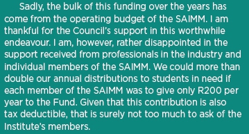 When one considers the importance of education and the minerals industry to the success of Southern Africa, I believe every member should be motivated to do their part and support the SAIMM Scholarship Fund every year Our members are successful and employed in well-paid jobs in the industry; they should be helping the next generation of students to become contributing members of society as well. *