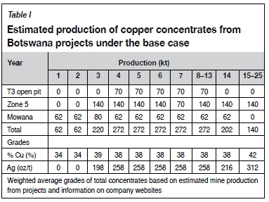 It is apparent that the approach by the exploration companies is to start the mining projects to demonstrate the robustness of project economics, and then rely on this to raise capital for expanded production. This approach is taken as the most likely scenario regarding the development of the copper mining projects in the KCB. Table II presents the projected concentrate production under this most likely scenario of the expansion case.