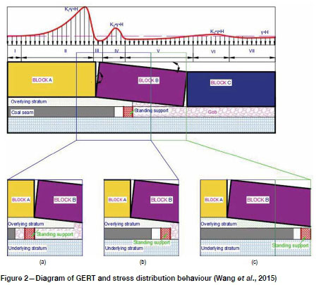 A large amount of research has been conducted to explore the deformation mechanism of the overlying strata in longwall systems by experimental investigation, theoretical analysis (Deng et al., 2010; Lu, Hua, and Zhao, 2011), numerical simulation (Zhang et al., 2018a) and field monitoring (Bai et al., 2015; Su et al., 2015). As a result, the stress distribution on standing support used for GERT is well understood (Li et al., 2016). Unlike the conventional layout of roadway, where the chain pillar is kept as a barrier to each working panel, GERT normally serves two working panels. As a result, both the deformation characteristics and the load distribution of the overlying strata will be significantly different. A diagram of the key layer and critical block for longwall operations, and sketch of the load distribution on standing support, is presented in Figure 2.