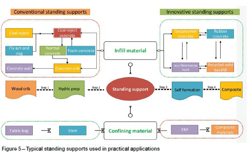 > Standing support in the form of wood cribs and hydraulic props made GERT possible. Since then, different types of standing support have been developed and put into practices in coal mines with various geological conditions and mining methods. The most popular standing supports are the packed wall made of wood cribs, hydraulic props, bagged coal rejects, concrete, concrete brick, foam concrete, rock blocks, and cementitious material. The other type of standing support is the tubular column, and includes the aggregate-filled steel column, concrete-filled steel column, and plastic bag column filled with high-water content material.