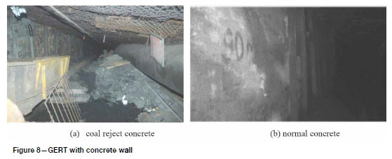 Apart from bagged coal rejects, various types of concrete including standard concrete, foam concrete, and coal rejects concrete have been used to construct the packing wall in GERT in recent years (Figure 8). The high strength of concrete is believed to be the primary advantage compared with bagged coal rejects. Among these concretes, coal rejects concrete is regarded as the most cost-effective backfilling material in GERT. More detailed information is contained in the next section. Since the coal rejects concrete wall is based on the bagged coal rejects packing wall, the advantages of using coal rejects will be described as well.
