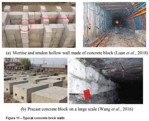 The concrete brick wall is another novel structure developed in recent years as an alternative standing support to the standard concrete wall. A concrete brick of standard size avoids the shortcomings of standard concrete in terms of the final setting time. The use of precast concrete bricks ensures a designed compressive strength (Figure 11). The special equipment designed for transportation and installation can effectively reduce the potential safety risk for miners. In addition, the use of precast concrete brick changes the building process of the packing wall from a manual basis to a much more efficient automated basis.