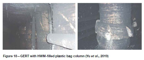 To eliminate the necessity for transport and dispoal of coal rejects i.e. the waste material from coal processing, some researchers have proposed the utilization of bagged coal rejects to form the packed wall as the standing support in GERT (Liu, 2015; Zhang et al., 2018). A large amount of research has been conducted to explore the feasibility of the use of coal rejects, both at the laboratory scale and in the field (Huang et al., 2011; Ju et al., 2015). These studies revealed that the physical properties of coal rejects, including the grain size, density, and the moisture content, will directly affect the compressive behaviour of the packed wall. Figure 6 shows two selected practical applications of GERT with the bagged coal rejects wall.