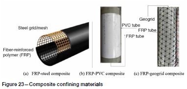 Compared with high-strength steel and FRP materials, the emerging composite materials shown outstanding combination effects and eliminate the defects when each the material is used alone. A good example of a composite confining material is the FRP-confined steel tubular column, where the outer buckling of the steel tube will be effectively restrained (Hu, Yu, Teng, 2011). The other type of FRP-steel composite consists of a steel grid or mesh cylinder with an FRP jacket covering both sides of the mesh, as shown in Figure 23a. As mentioned earlier, the main role of the outer container used in standing support is to provide confinement rather than to resist axial loading, therefore the novel FRP-steel mesh composite is believed to be much more cost-effective for the same confinement. Most importantly, the steel mesh will provide sufficient residual loading resistance after the rupture strain of FRP is reached.