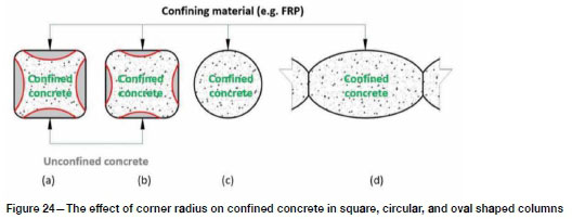 The confinement provided by an exterior container with either square or rectangular cross-section is believed to be inferior to that of a circular column. Taking FRP-confined concrete as an example, when the same amount of FRP composite is used, the extent of enhancement is directly related to the corner radius (Al-Salloum, 2007). As shown in Figure 24, with increasing corner radius, the effect of force concentration in the corners of a square column will be reduced, resulting in a relatively uniform distribution of the confining pressure.