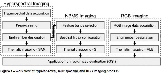 The ultimate goal of this study is to develop an automated rock-mass classification system that will overcome accessibility and human bias issues using advanced image processing technologies. To achieve this goal, a quantitative approach for evaluating the degree of weathering using NBMS imaging was investigated. In the following sections we detail the processes for developing thematic maps using hyperspectral, NBMS, and RGB imaging, and discuss how the quantified weathering degree information was integrated into GSI (rock mass strength) estimates for the study site.