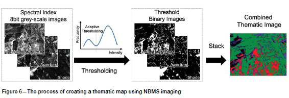 Thematic mapping shows the spatial distribution of the features of interest on the image. It involves mapping the spectral index values in image pixels to a 16-bit grey scale. To classify features on the map in a binary way, a threshold was then defined to distinguish weathered and aperture areas from non-weathered (background) areas. This process was automated using the adaptive threshold technique (Otsu, 1979) instead of using a fixed (absolute and specific) threshold value. It determines the thresholding values based on the relative difference between the intensity of the featured object and background, mitigating the misclassification caused by the global intensity gradient. The binary images of each spectral index were all combined to create a thematic map. The overall process of thematic mapping and image processing is described in Figure 6. Non-weathered, weathered, aperture, and shaded areas are shown in Figures 7c and 7d as green, red, blue, and black respectively.