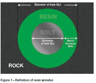 The thickness of the resin surrounding the installed tendon (see Figure 1) is a critical determinant of the support capacity of the rockbolt, as the mixing and resultant strength of the installed resin bolt is dependent on adherence to the resin annulus limits as specified by resin manufacturers (Ferreira, 2012).