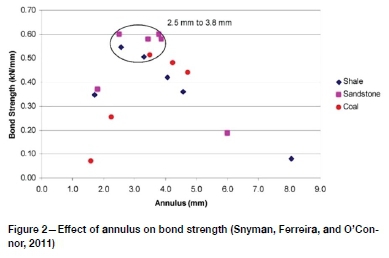 Industry testing in soft rock applications has indicated that the optimal annulus range to maximize the bond strength of conventional ribbed bolts lies between 2.5 mm and 4.5 mm, as illustrated in Figure 2 (Canbulat et al., 2015; Mark et al., 2003). Laboratory testing using internally threaded pipes, which approximate hard rock applications, has confirmed that the optimal annulus for resin bolting is approximately 24 mm (Snyman, Ferreira, and O'Connor, 2011).